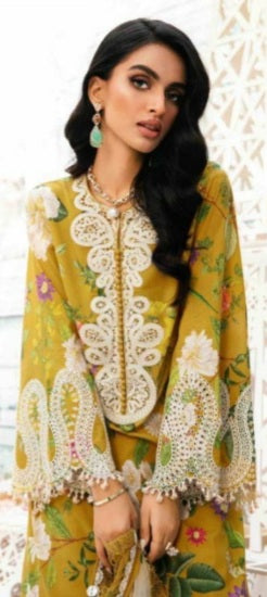 This outfit is a sophisticated example of Pakistani Ethnic Wear, specifically a three-piece lawn or luxury cotton suit. It features a vibrant mustard-yellow palette with intricate floral motifs and heavy lace detailing.