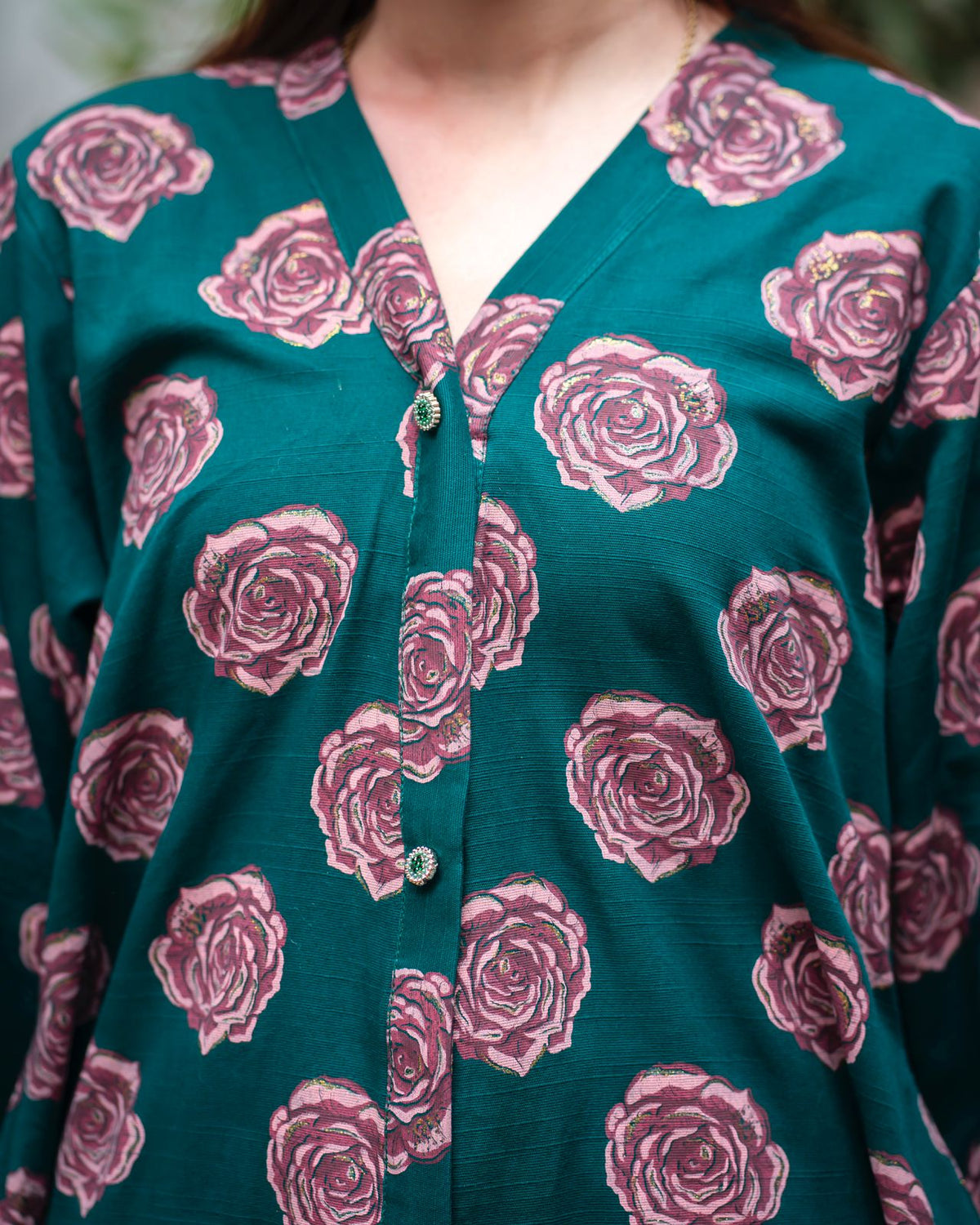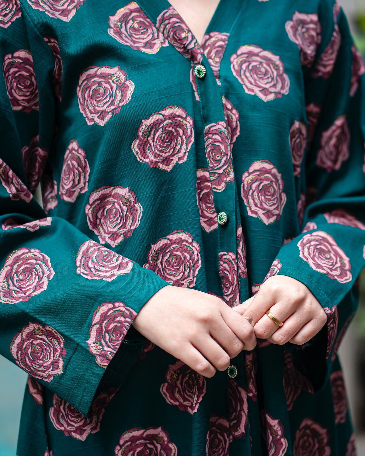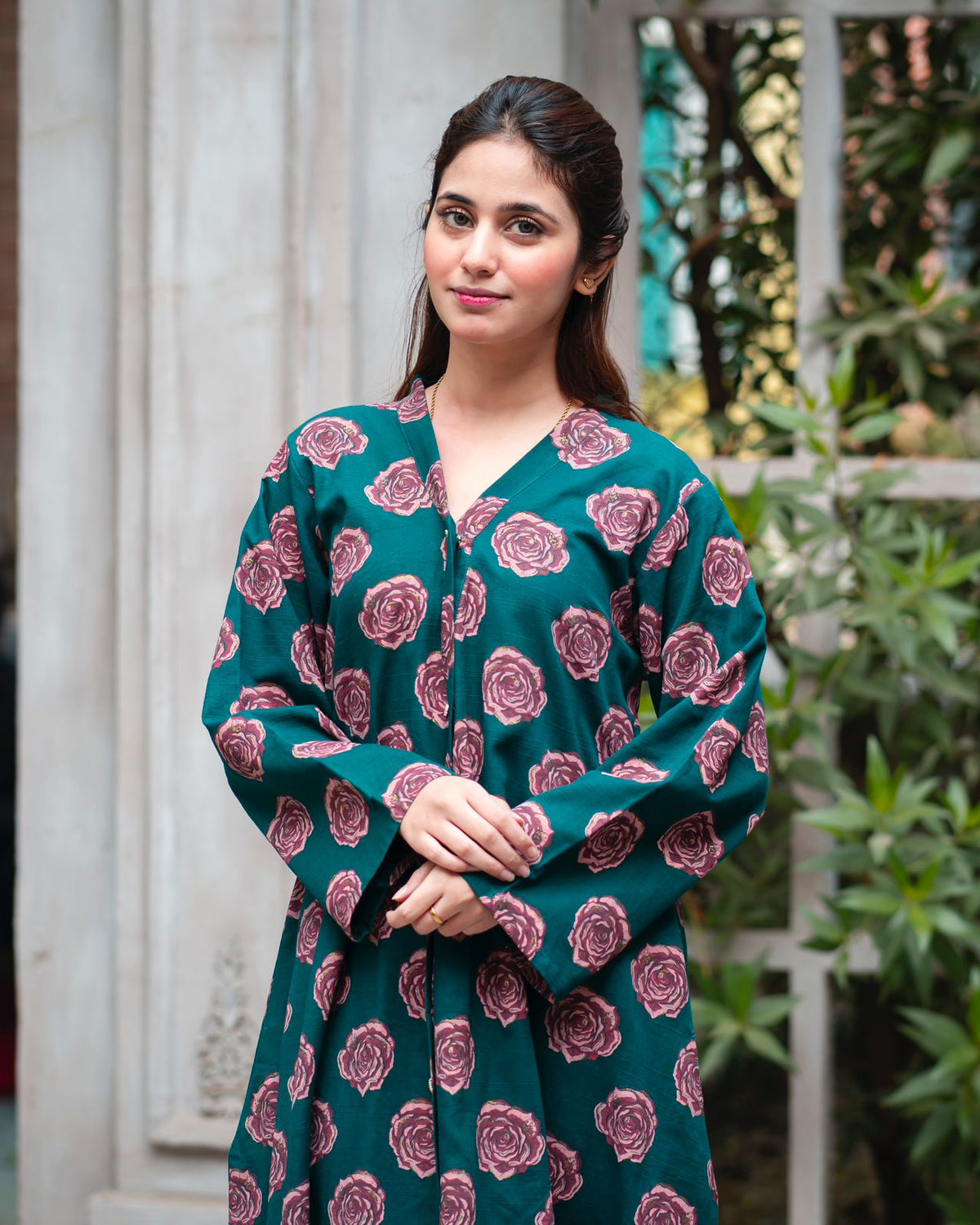 Embrace sophisticated romance with our stunning Deep Emerald Rose Print Khaddar Frock. This elegant piece features a lush floral pattern on a rich, saturated base, combining the classic comfort of Khaddar with a flattering, modern silhouette—perfect for any stylish gathering.